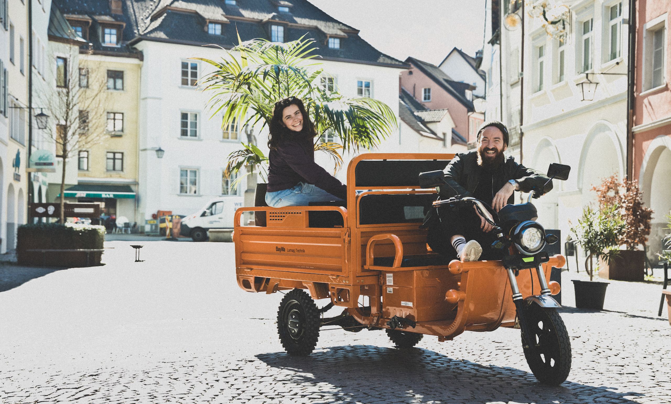 Auf Österreichs Straßen als Fahrrad zugelassen und mit bis zu 25 km/h Geschwindigkeit, fügt sich das E-Lastedreirad nahtlos auf allen Straßen ein. Ausstattbar mit einer kippbaren Ladefläche und einer Überdachung vereint das Lastendreirad Komfort, Praktikabilität und Leistbarkeit unter einem Dach. Für Bauernhöfe, Landwirte, Winzer, Gärtnereien, Naturparks, Tiergärten, für firmeninterne Wege oder auch für diverse Arbeiten im Privatbereich – das Lastenrad ist überall der ideale Begleiter.